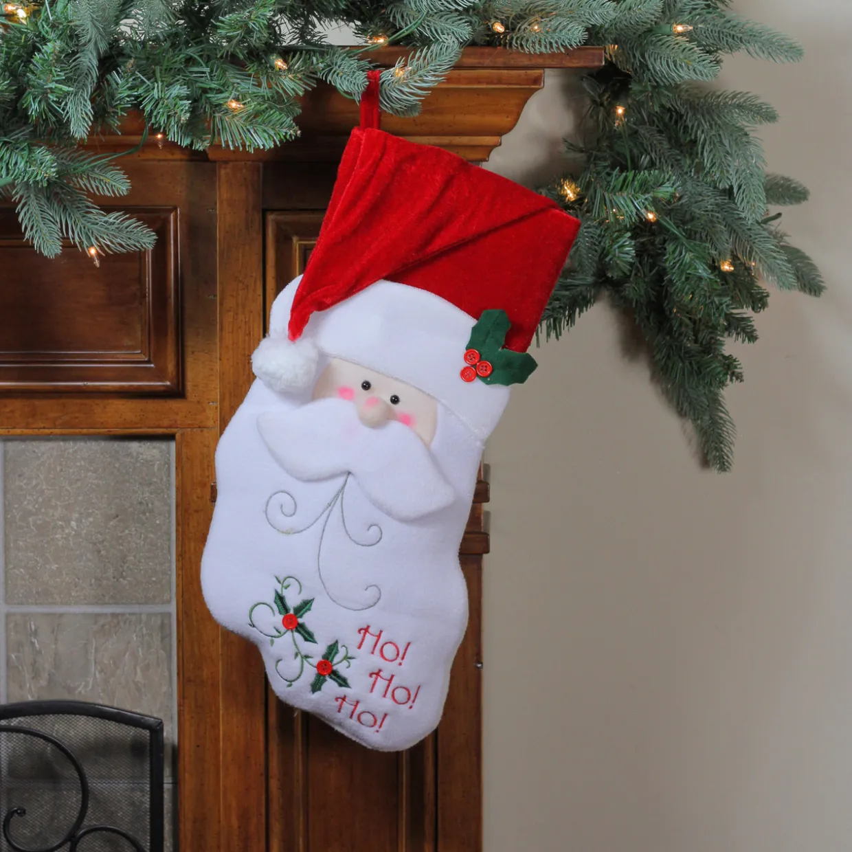 - Stocking features embroidered design saying Ho Ho Ho