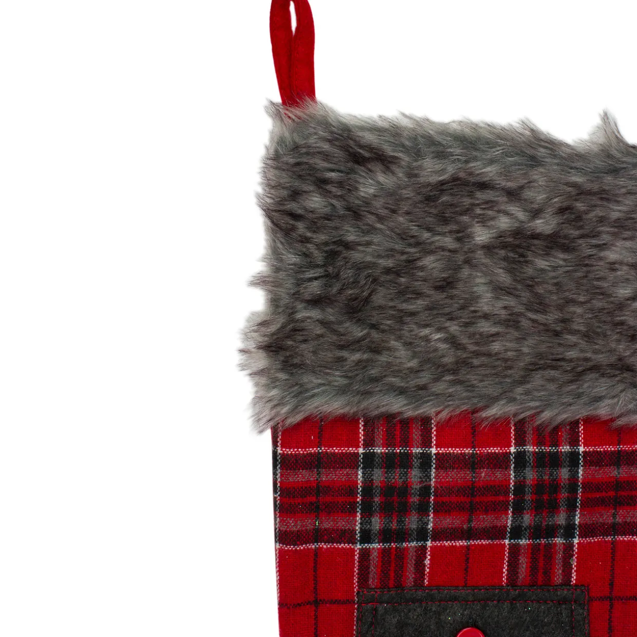 - There is a gray and brown faux fur cuff with a red fleece backing