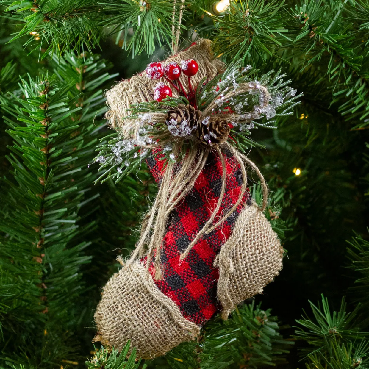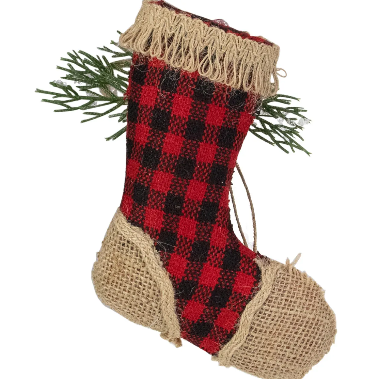 - Buffalo plaid design with burlap and glitter accents