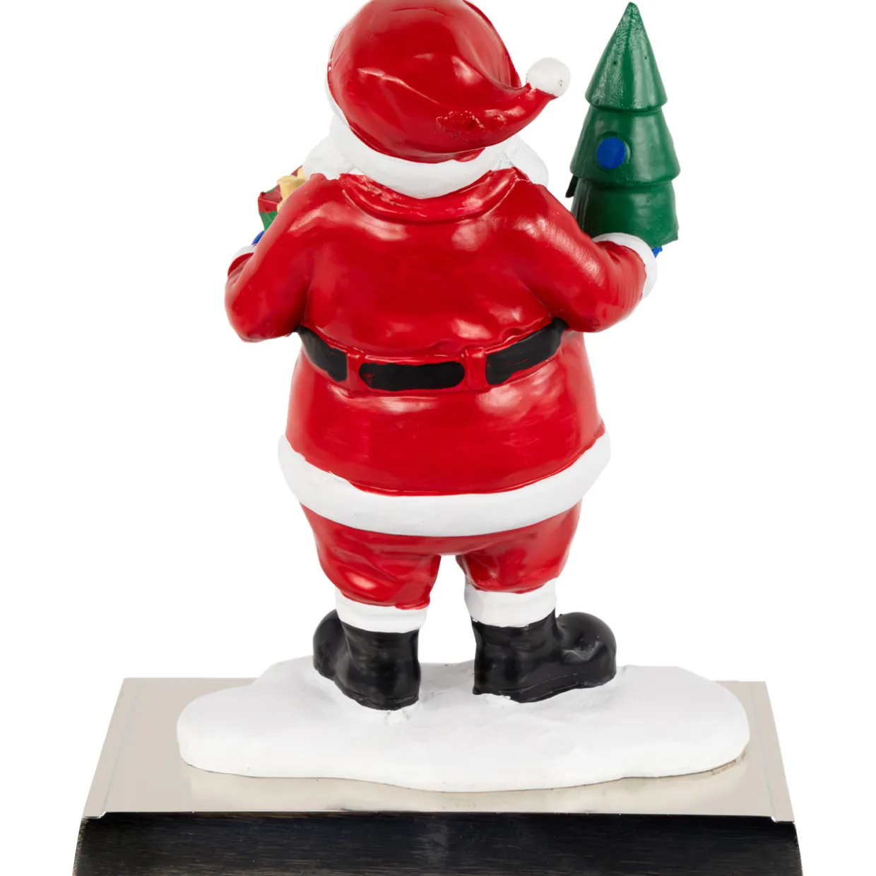 - Santa holds a Christmas tree and a present