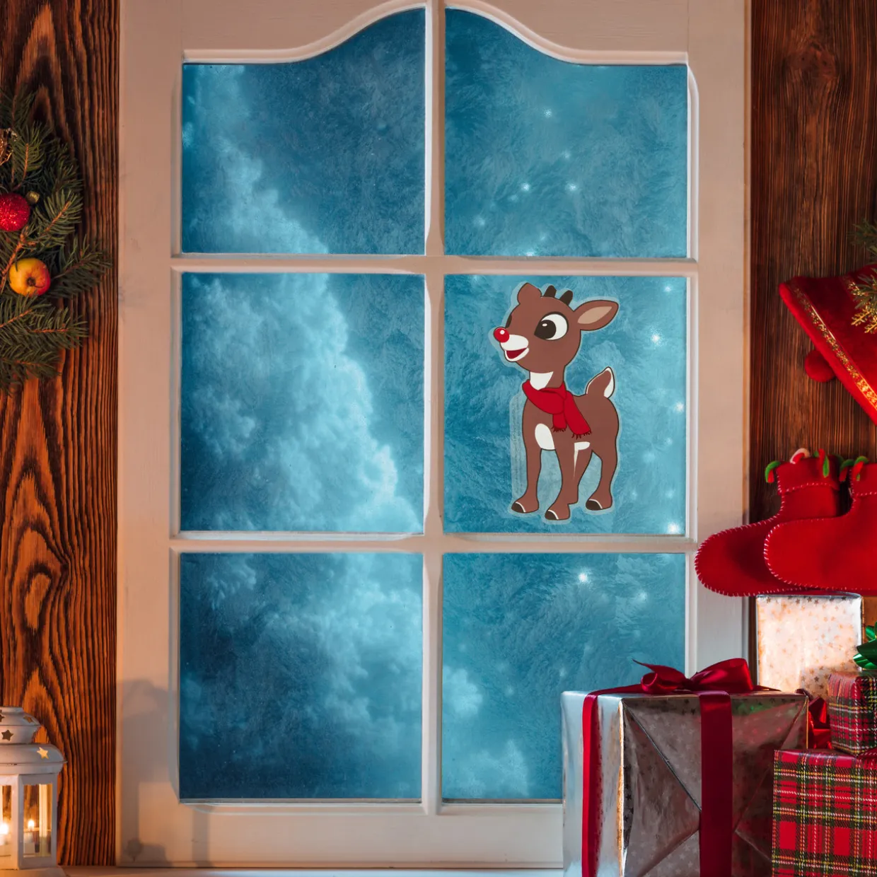 - Rudolph wearing a red scarf Christmas window decoration