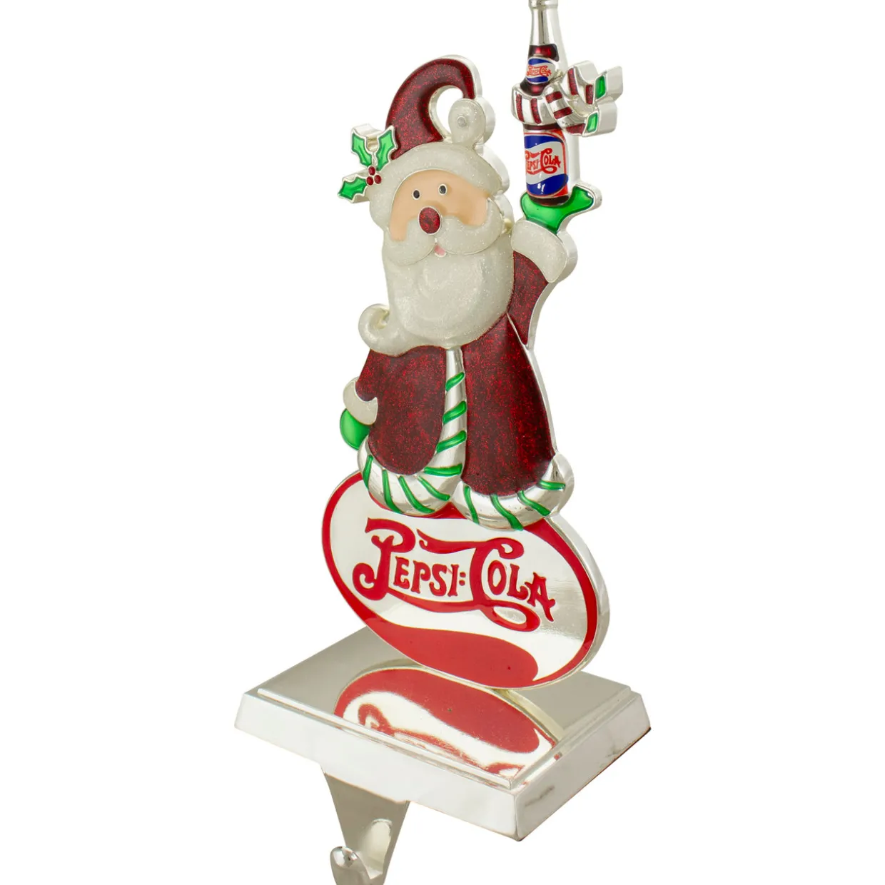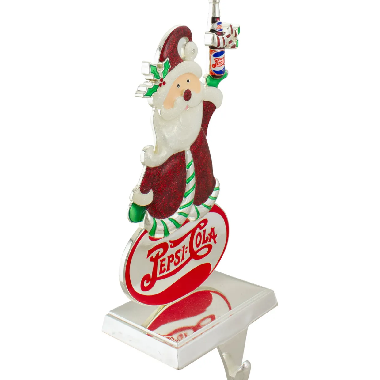 - Features Santa Claus holding a bottle of Pepsi and standing on a Pepsi Cola logo
