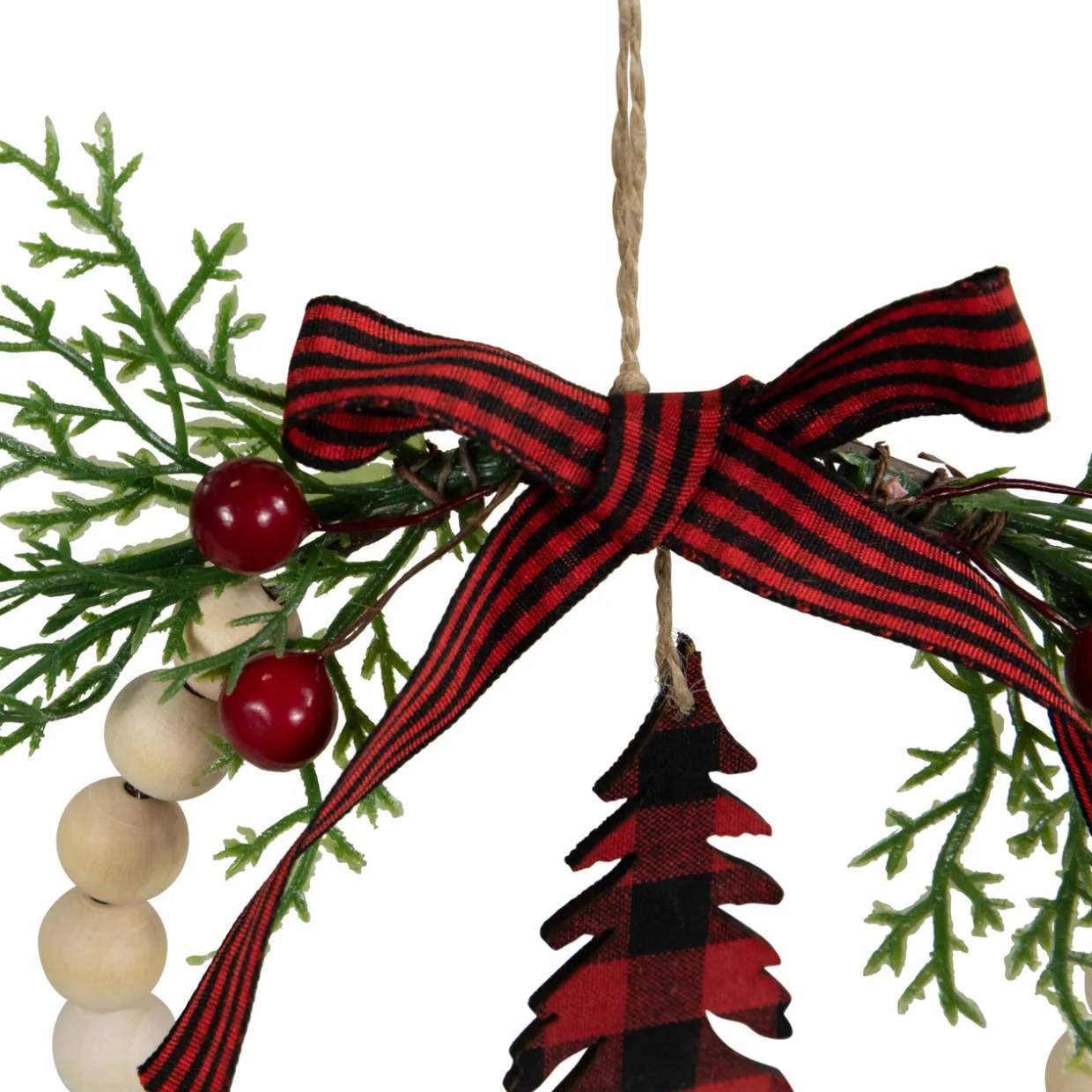 - Accented with pine sprigs; berries and a checkered ribbon bow