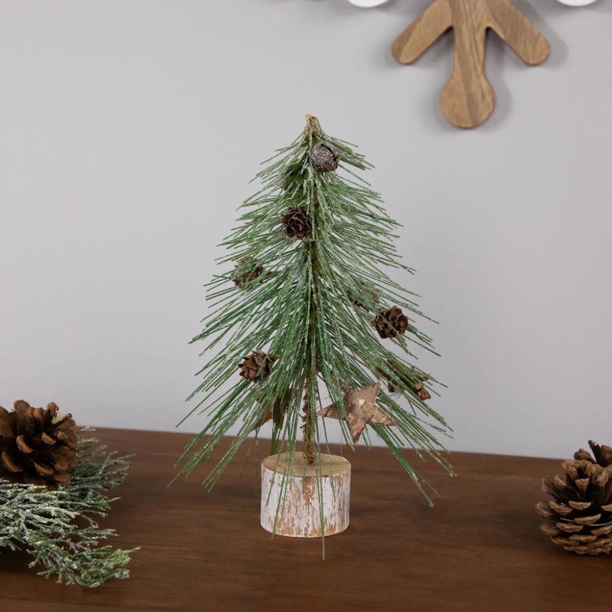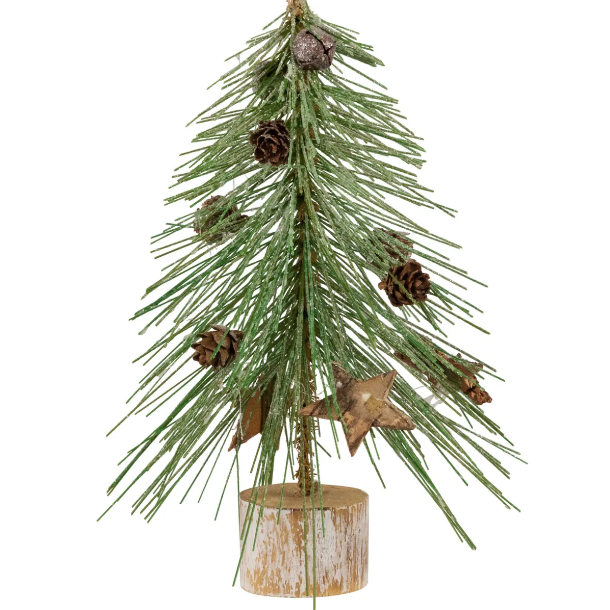 - Adorned with mini pinecones; star cutouts and rustic bells