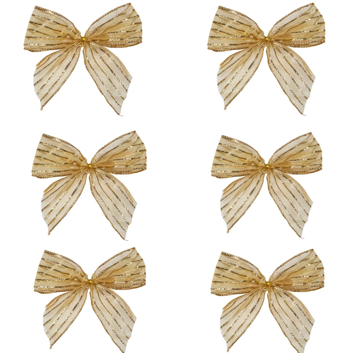 - Pack Of 6 Gold Glitter Striped Christmas Bow Decorations