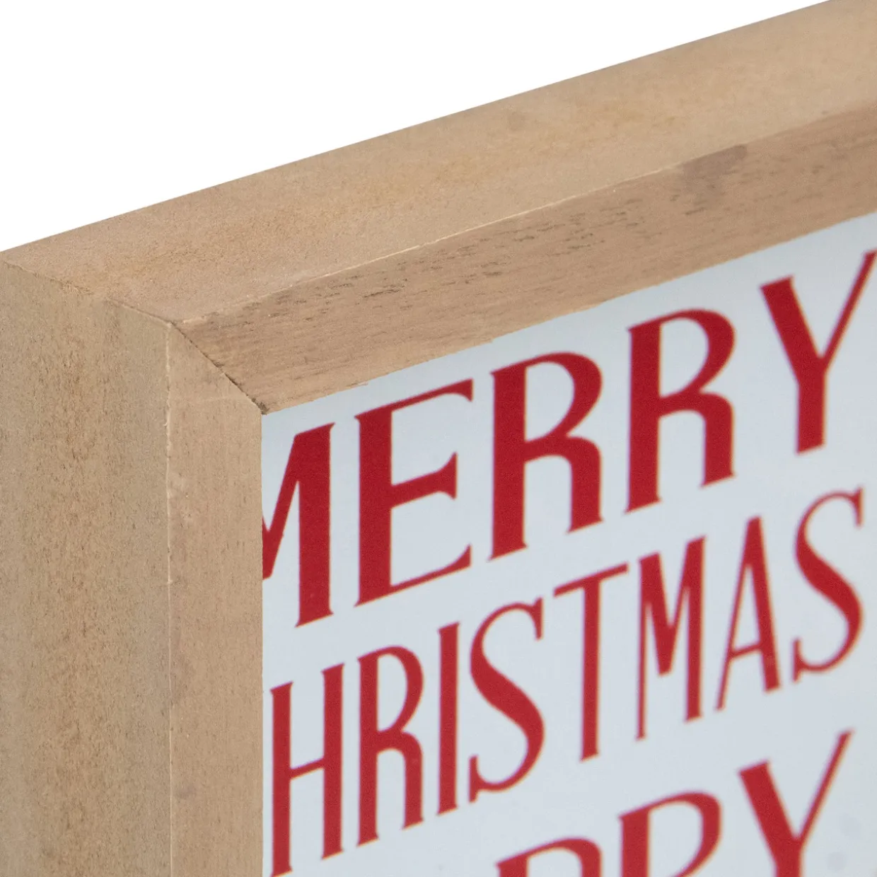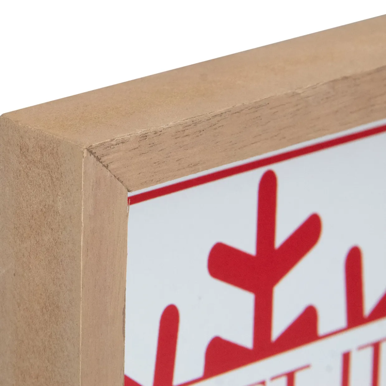 White with red lettering framed in wood