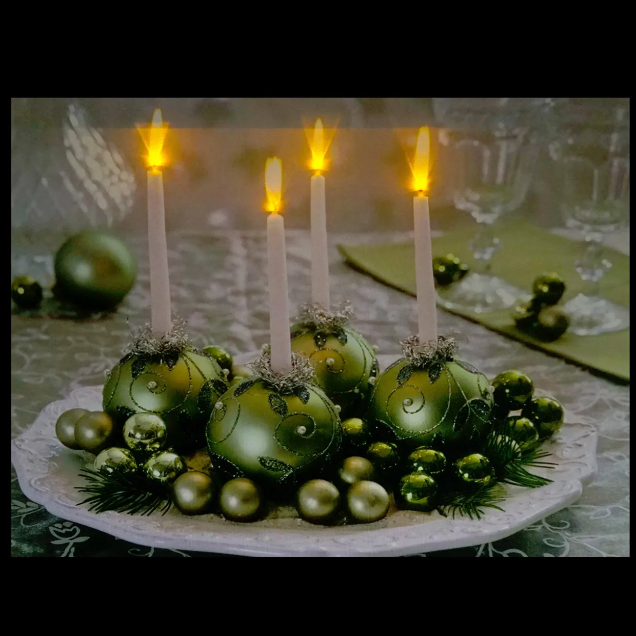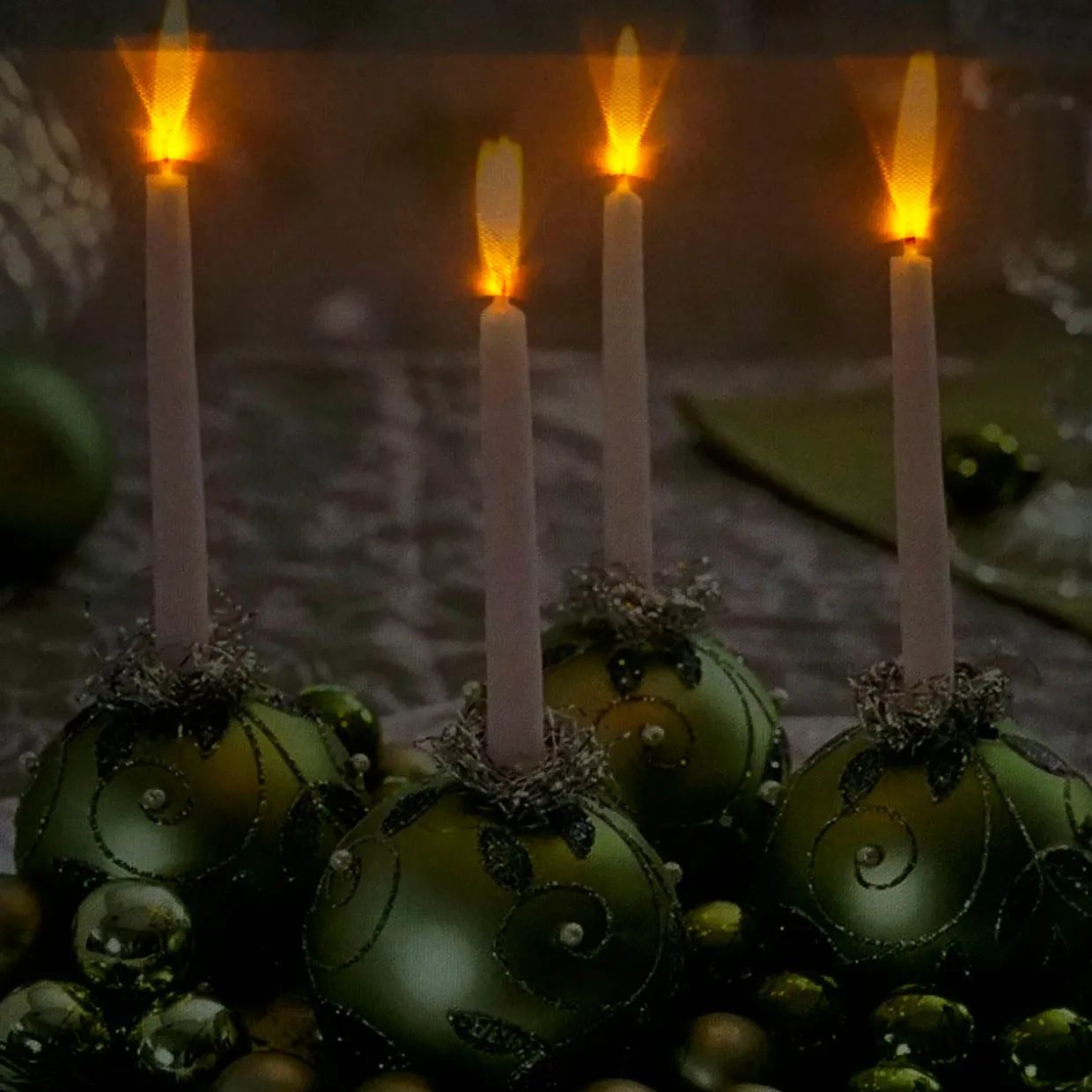 - Each candle flame is illuminated by a flickering LED light