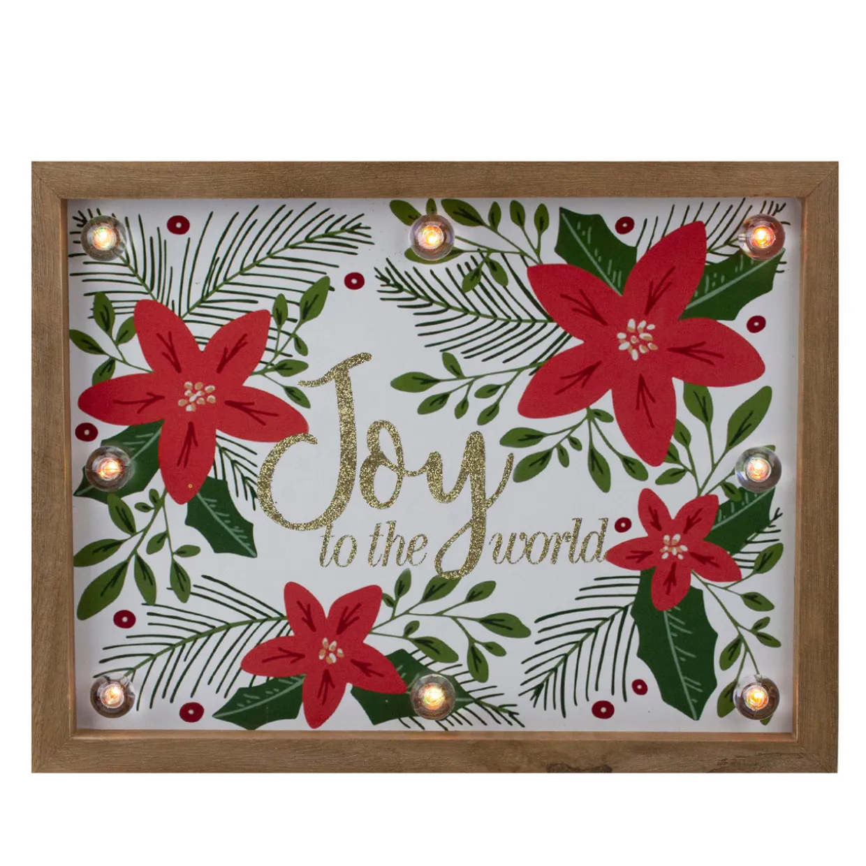 - Features red poinsettia flowers with green leaves surrounding a Christmas saying