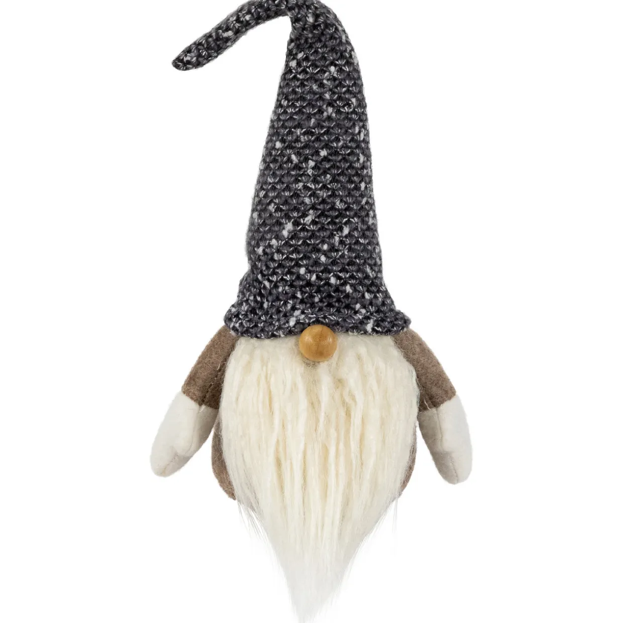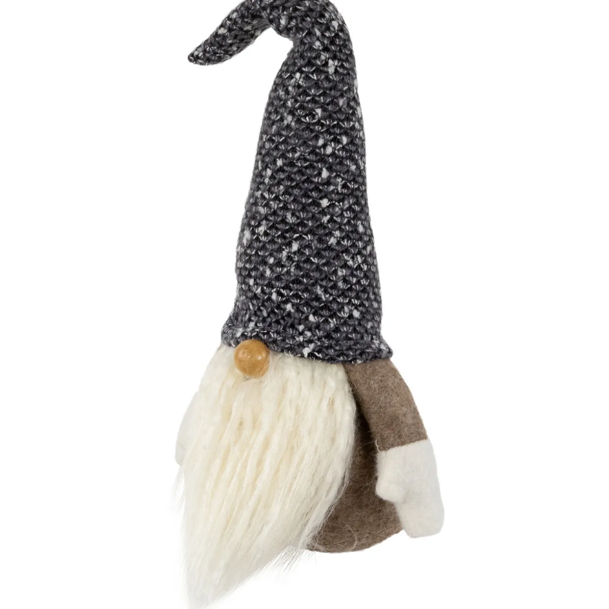 - The gnome wears a brown suit with a gray pointy hat