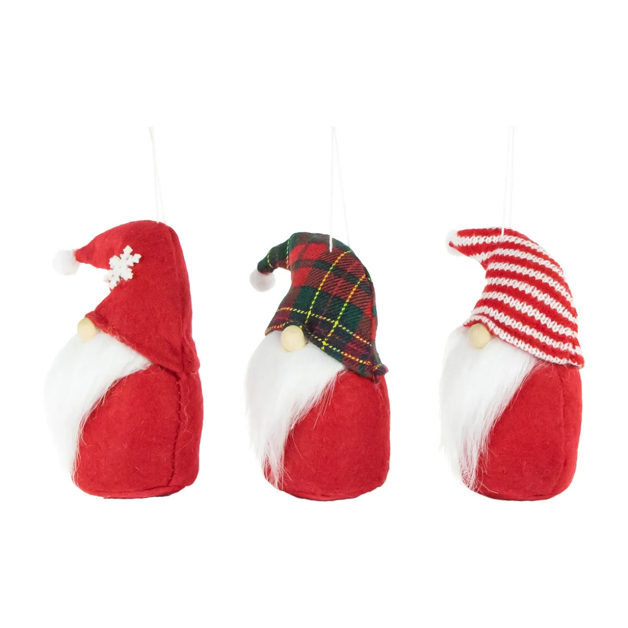 - One hat is red with a white snowflake, one is red and white striped, one is red and green plaid
