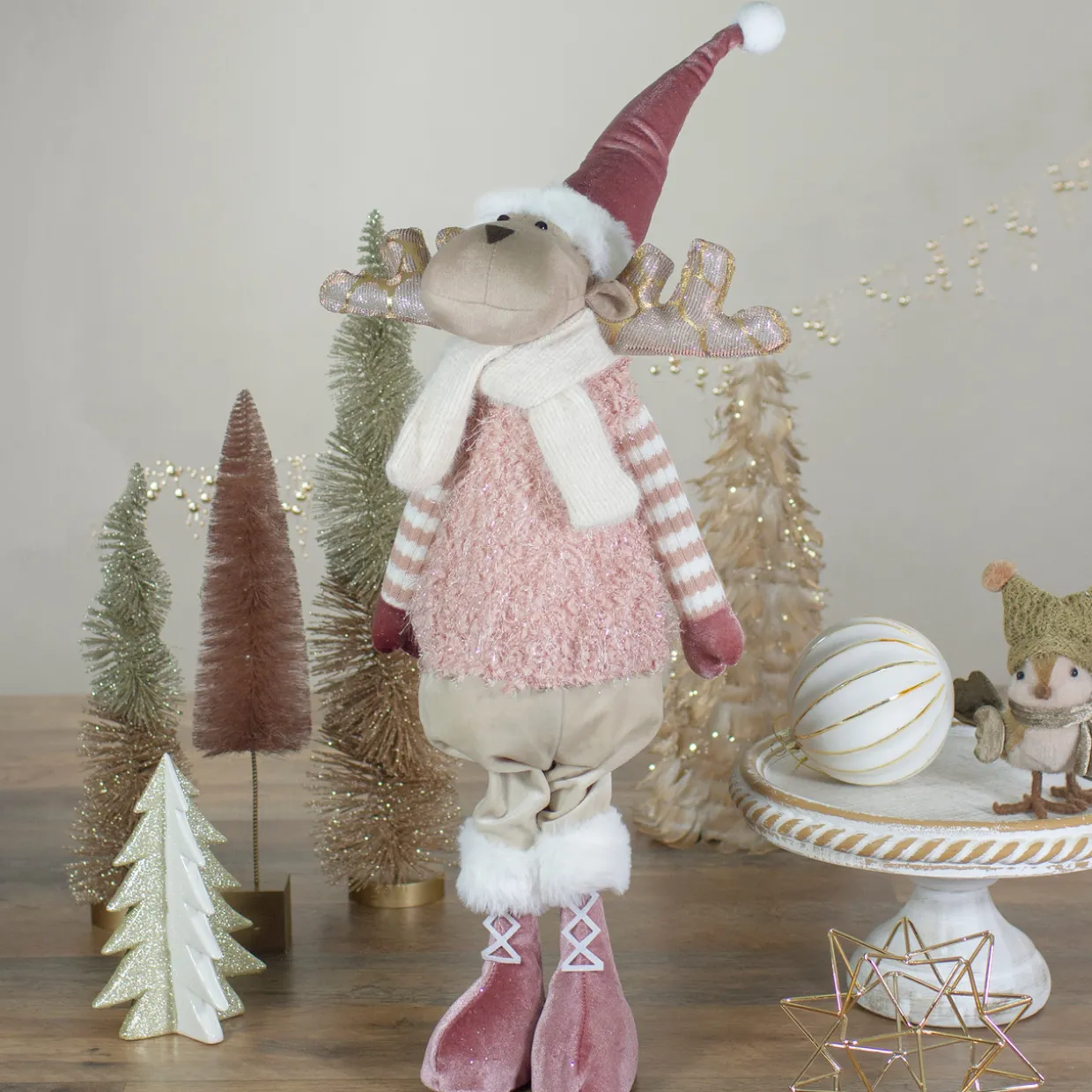 - Wears a mauve pink eyelash knit sweater and beige pants