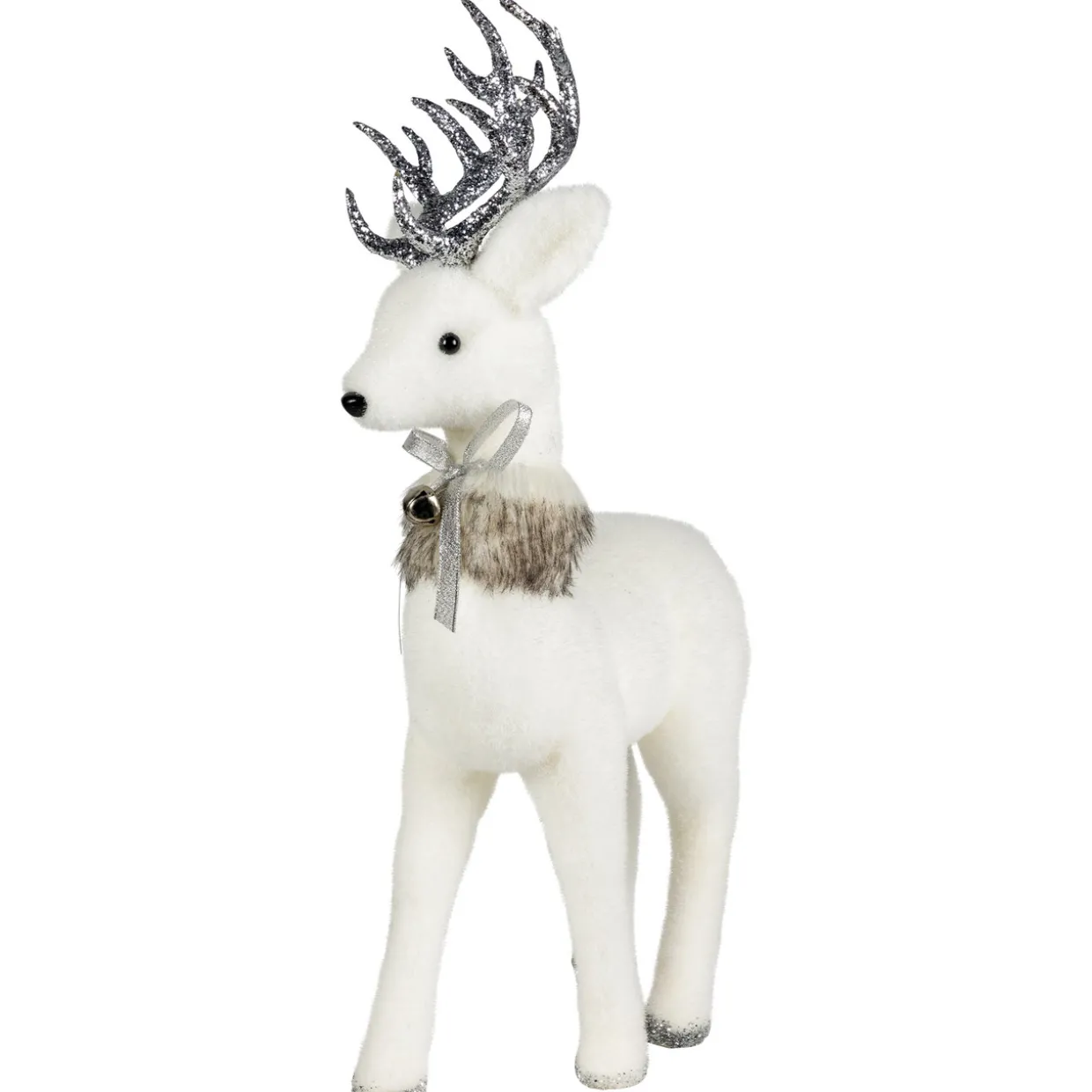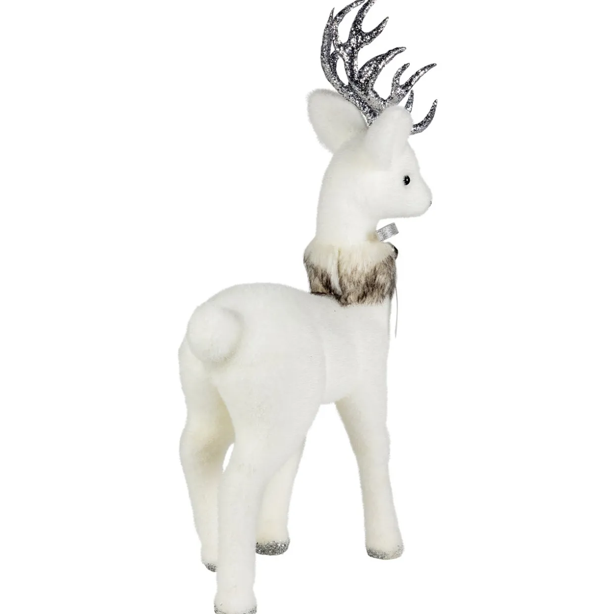 - White And Silver Deer Christmas Figurine With Faux Fur Tie