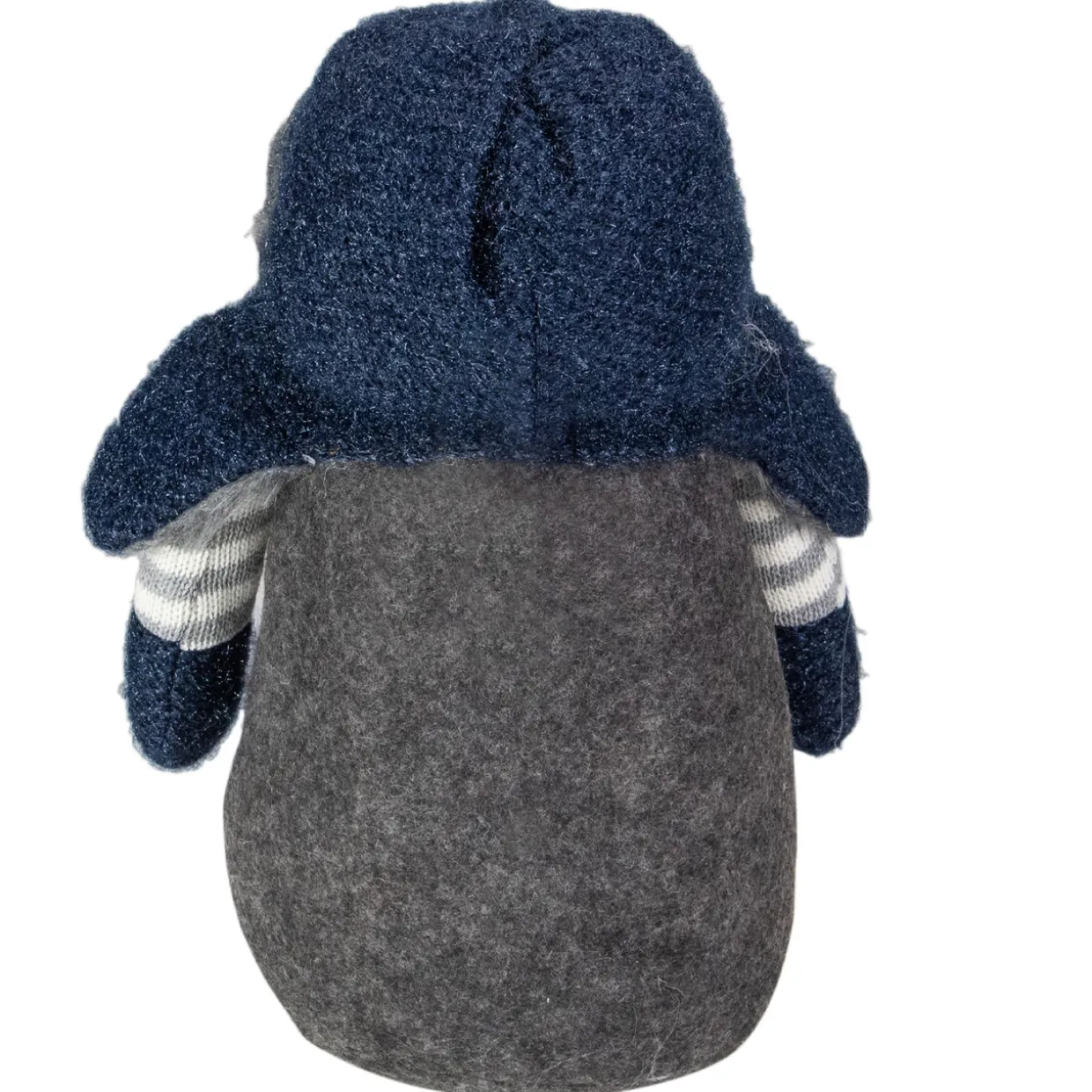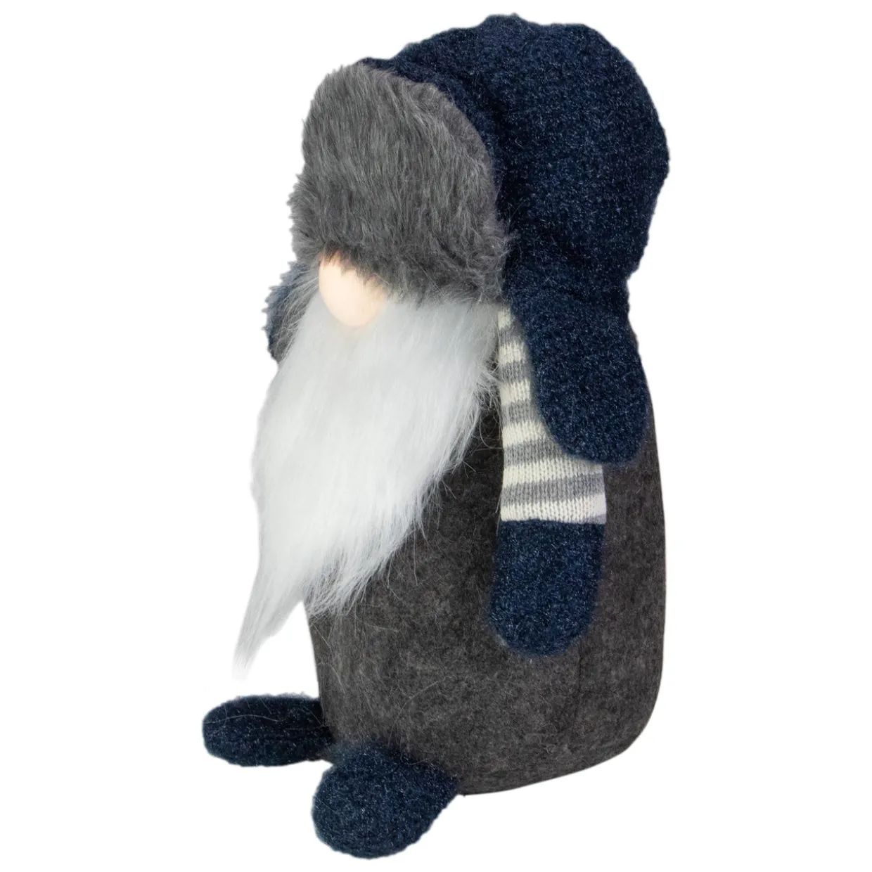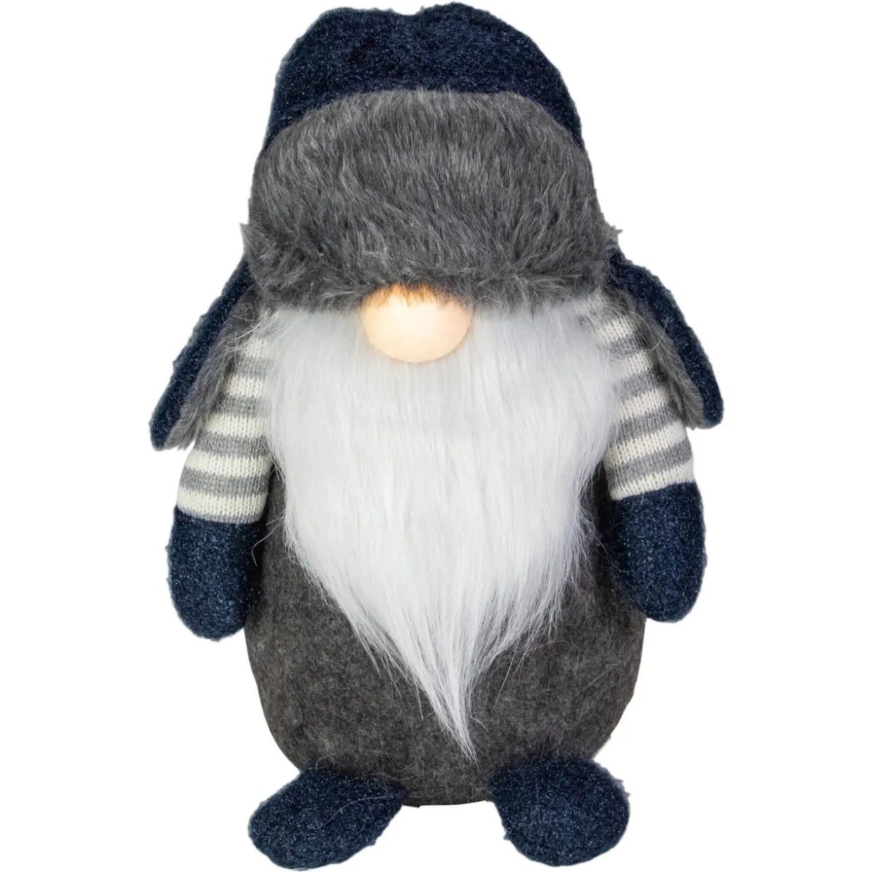 - The gnome is wearing a plush blue and gray winter trapper hat