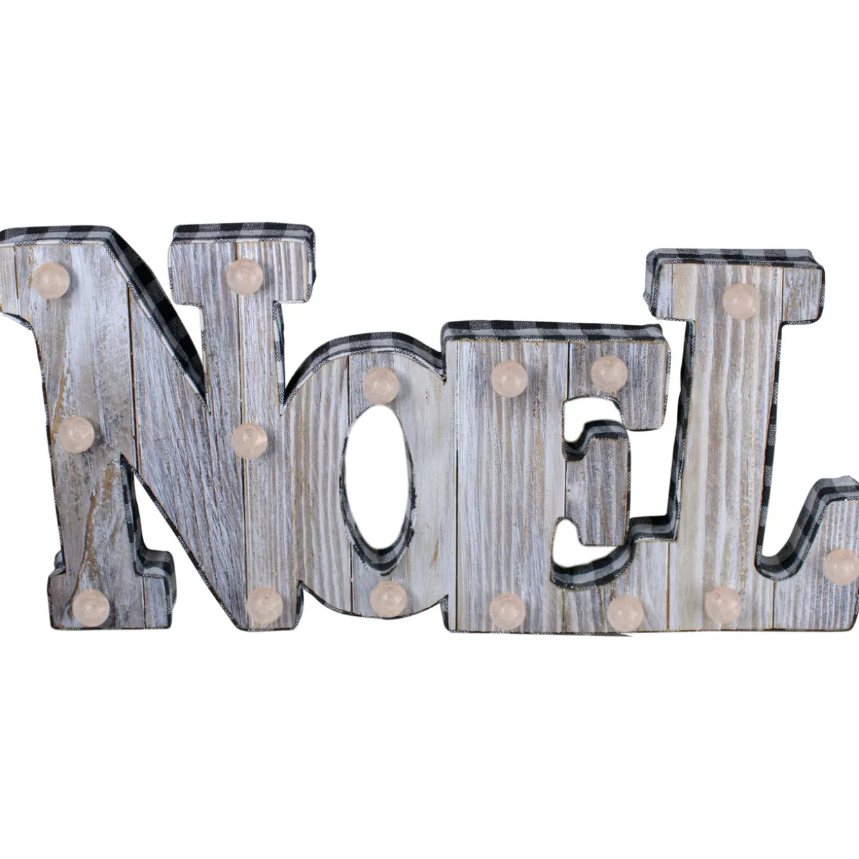 - Features 13 white bulbs that surround the word noel