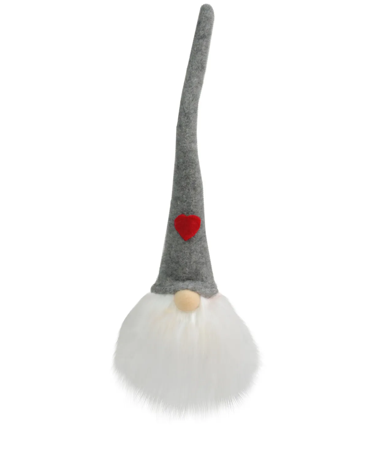 - Wears a large gray hat with a red heart applique