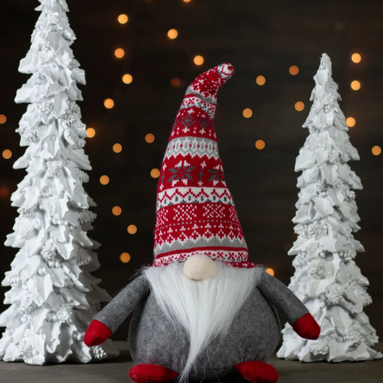 - The gnome has a gray body with a white beard and beige nose