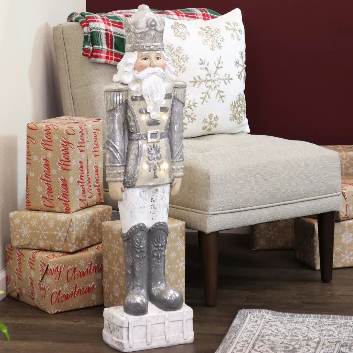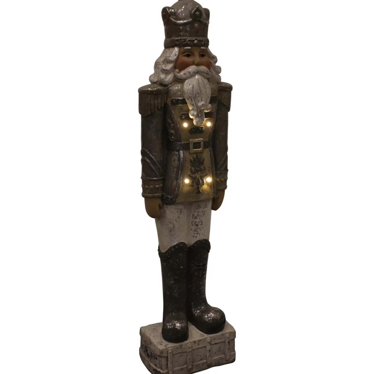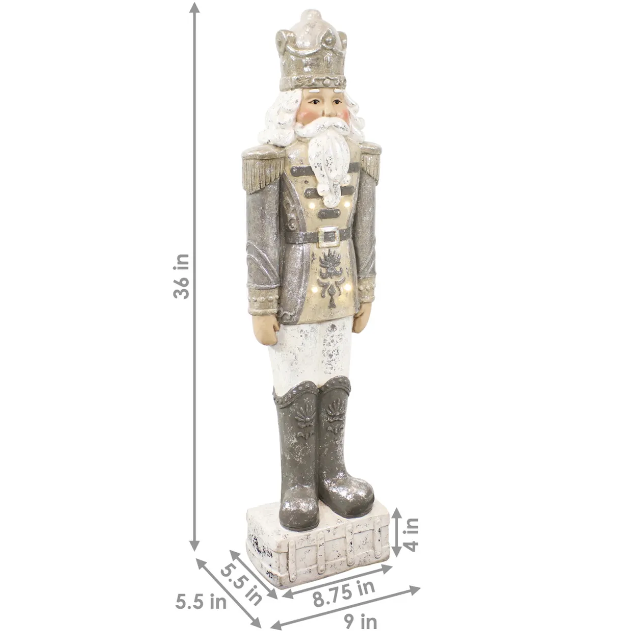 - NOBLE NUTCRACKER: This giant nutcracker statue is just the right size for the fireplace mantel, entryway, living room, or front porch. This nutcracker figurine measures 9″ W x 5.5″ D x 36″ H, weighs 11.4 lbs, and has 4 LED lights built in. The…